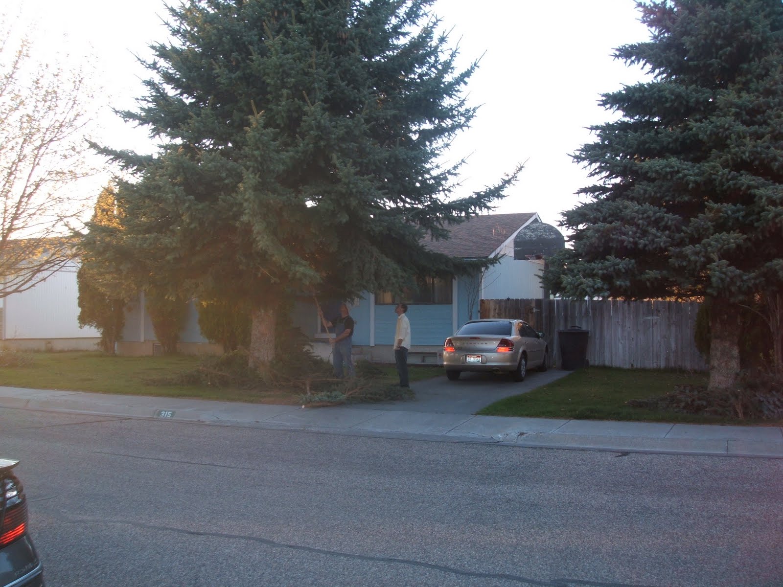 We did have two 30+ ft tall pine trees in our front yard cut down.. This is the first of many taking out projects in the front yard. Before we even begin putting things back together. All the shrubs are coming out, the front steps are coming out and the current walk way. We will be putting in new cement stairs, facing out, raised flower bed along the longer part of the house, cement walk way to the drive way with large paver stones staggered to the street. a little porch with flowers in front of the living room window. Siding and new windows. Wow what a project.